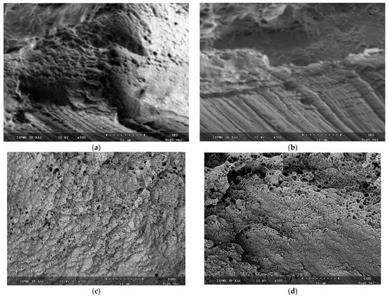 Fracture surface of a sample grown at 0.21 kJ/mm can be classified as a surface obtained as a result of mixed viscous/brittle fracture mechanism. Quasi-brittle fracture microgrooves can be observed in Figure 15b along with microcells (Figure 15a), usually inherent with the viscous fracture. Fracture surfaces of samples printed at 0.255 kJ/mm (Figure 15c) and 0.3 kJ/mm (Figure 15d) demonstrate the presence of only viscous fracture microcells and ridges.