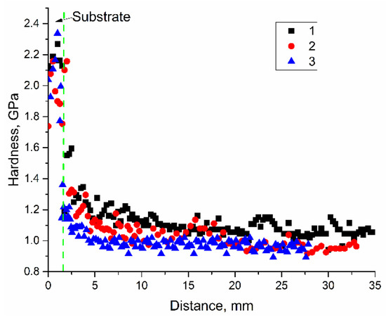 Microhardness profiles as measured along the wall height. EBAM regime: 1, 0.21 kJ/mm; 2, 0.255 kJ/mm; 3, 0.3 kJ/mm.