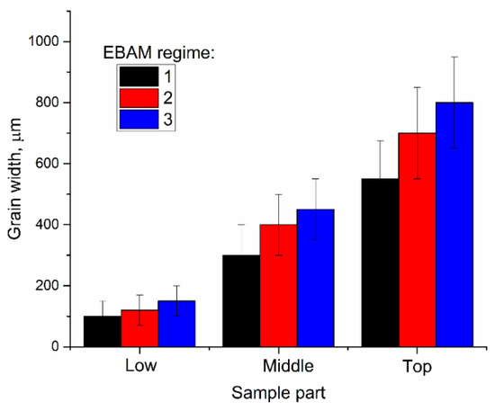 Grain width in different parts of the samples. EBAM regime: (1) 0.21 kJ/mm; (2) 0.255 kJ/mm; (3) 0.3 kJ/mm.