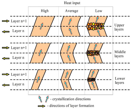 Interpass deformation may be one of the most effective methods against the epitaxial growth of large columnar grains [23,24,25,26,27]. However, tuning the heat input may be effective too [28], and would be less tedious and labor consuming. Another remedy may be found in using the heat input that is exponentially changing as a function of the build-up metal height [29].