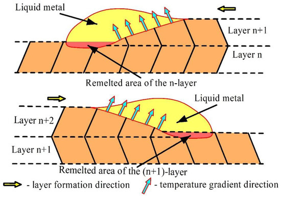 In the beginning of deposition, a high cooling rate is achieved when depositing first layers on a cold substrate so that equiaxed grains and even discontinuities, lack of bonding or even hot cracks [21,22] are often formed there. Therefore, increasing the heat input during deposition of the first layers is required to avoid defects. At the same time, reduction of the heat input is required when depositing the top layers due to poor heat removal via reheated underlying layers. Obtaining optimal as-deposited metal structures, and therefore mechanical characteristics, is another problem to be resolved with the DED additive manufacturing. Formation of columnar grains under conditions of either excess heat input or low solidification rate serves to enhance the anisotropy of mechanical characteristics, which is already inherent in them by definition.