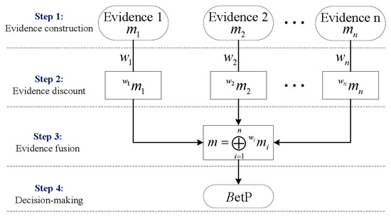 In this subsection, some necessary basics of evidence theory are introduced. Evidence theory, also called Dempster–Shafer theory or belief functions theory, is a generalization of probability framework [20,21]. It is known for the advantages of information fusion and uncertainty representation. Let denote mutually exclusive and exhaustive solutions for an investigated problem. Then is called the frame of discernment for this problem. All of the subsets of compose the power set . It is important to note that evidence theory is established on the power set. Assume that pieces of evidence measuring the possible solutions can be obtained. The main framework of evidence theory can be briefly summarized as shown in Figure 1. There exist four steps, and the related definitions are detailed as follows.
