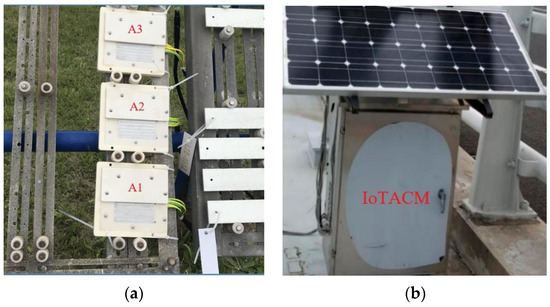 The atmospheric corrosion monitoring tests in this study were conducted at Qingdao (36.07 degrees north latitude and 120.44 degrees east longitude), eastern China, which has a costal humid temperature climate [25]. The principle and availability of the employed Internet of Things Atmospheric Corrosion Monitor (IoTACM) were detailed in our previous research [5]. Following the related instructions [5], the real-time corrosion rate of specimen can be calculated based on the real-time voltage ratio and initial height of the specimen. In this study, three Q235 steel specimens were tested from 25 September 2017 to 24 December 2017, lasting for three months. The sizes (length × width × height) of the A1, A2, and A3 specimens were 70 mm × 70 mm× 0.15 mm, 70 mm × 70 mm × 0.4 mm, and 70 mm× 70 mm × 0.4 mm, respectively. Figure 2 shows some details of the field test. The specimens were installed in an exposure shelf toward the south with a 45-degree angle to the ground. The IoTACM was placed approximately 10 m from the shelf. In addition, humidity and temperature sensors were also placed next to the shelf to record the real-time RH and T of the current environment.