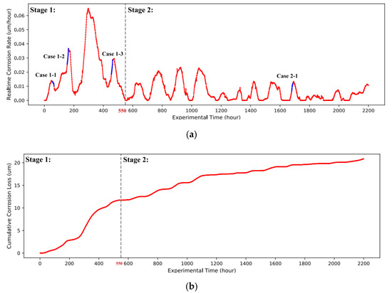 In this study, the real-time corrosion rates of three Q235 steel specimens and RH and T data were recorded hourly by IoTACM. There were 2200 data samples without missing values. Although only small errors existed among the corrosion rate data of three specimens, the average real-time corrosion rate of A1, A2, and A3 specimens was evaluated so as to improve the reliability of the data. Figure 3a draws the variations of the real-time corrosion rate (y-axis) with exposure time. Similarly, Figure 3b draws the variations of cumulative corrosion loss (y-axis) with exposure time. Apparently, the corrosion rate significantly fluctuated in a large range and the fluctuation gradually flattened out over time. This is consistent with the power law that the specimens were seriously corroded in the early period, while the corrosion gradually turned slightly with time [26]. In this study, the test period was divided into two stages in order to reveal their underlying different corrosion mechanisms. We took the moment with 50% of the total cumulative corrosion loss as the separation of two stages. Accordingly, as shown in Figure 3a, the corrosion process in test period [0, 550] is defined as Stage 1 (23 days, nearly one month), and the subsequent period [550, 2200] refers to Stage 2. In this case, above 50% of the total cumulative corrosion loss was caused in Stage 1 within only 25% of the total test time. The mean corrosion rate in Stage 1 was 0.021 μm/h, which is 3.5 times that in Stage 2 (0.006 μm/h). It is reasonable to take Stages 1 and 2 as the fast and slow corrosion periods, respectively.