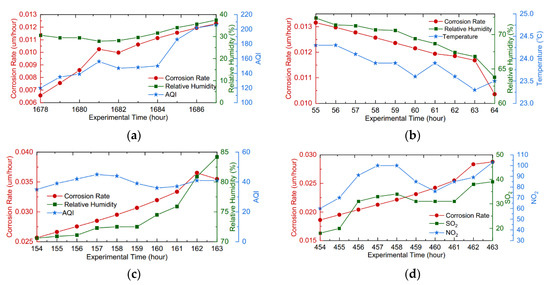 In order to visually show the impact of different atmospheric factors on the corrosion rate, the curves of four illustrative cases marked in Figure 3a are drawn. The left y-axis in Figure 4 measures the real-time corrosion rate. Meanwhile, the right y-axes in different colors measure the concentrations of corresponding envrionmental factors. As shown in Figure 4b, the decreasing corrosion rate was associated with the gradual reduction in RH and T, while the concentrations of the pollutants remained stable in this period. The period of Figure 4c met with relatively stable values of T and AQI. Moreover, the rise in the corrosion rate with time was significantly influenced by the rapid increase in RH. In the above two cases, the variances of RH and T resulted in thickness variations of the thin electrolyte layer, which directly affected the corrosion rate. Similarly, the RH and T in the periods of Figure 4a,d basically remained stable. However, the air pollutions gradually increased as a whole, especially in the period of Figure 4a. Accordingly, there was a rapid increase in the corresponding real-time corrosion rate. The corrosive components of the pollutants might be dissolved on the surface of specimens, which accelerated the corrosion behavior. The above analyses lead to the conclusion that the RH, T, and these contaminants are positively correlated with the corrosion rate.