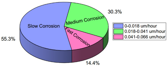 The corrosion rate data in Stage 1 were classified into the three corrosion degrees of fast, medium, and slow. A commonly used unsupervised K-means method (the function K Means in the Python package of Sklearn) [33] was used to avoid the subjectivity of manual classification. The results are shown in Figure 5. For the real-time corrosion rate at exposure time t, the corresponding corrosion degree was defined as follows: