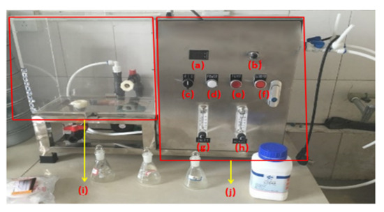 Strong alkalinity full-automatic electrolyzed experimental water machine: (a) current and voltage display screen; (b) current and voltage adjustment button; (c) total power supply; (d) power indicator lamp; (e) water pump power supply; (f) electrolytic power supply; (g) total water output adjustment button; (h) adjustment button for water output of AEW; (i) container; (j) electrolyzer.