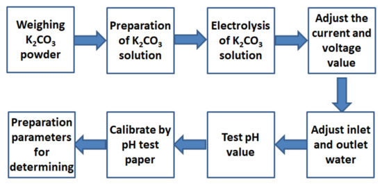 The AEW preparation process adopted the trial production method. The performance of AEW was characterized by the hydrogen ion activity (pH) and oxidation-reduction potential (ORP) value of the solution. The pH value of the electrolytic water increased with electrolyte concentration, voltage, and current and decreased with water inflow and outflow. After the ORP value reached about 200 mV and the conductivity reached about 2700 μs/m, the pH value of AEW was tested with a pH tester and proofread with a pH test paper. After many trials, we satisfactorily established the preparation parameters for AEW with different pH values. Figure 2 gives the preparation steps and the preparation parameters in Table 4.