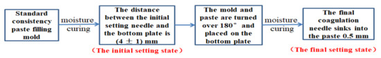 The working of paste refers to the determination method specified in “Test Method for Water Requirements of Normal Consistency, Setting Time and Stability of Cement Standard Consistency” (GB/T1346-2011, China). The experimental instrument was a standard Vicat instrument (including test rod, initial setting needle, and final setting needle). The test process of water requirements for normal consistency are shown in Figure 3. Initial setting time and final setting time are the time between adding water to the cement paste in the initial setting state and final setting state, respectively, as shown in Figure 4.