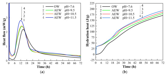 Hydration heat analysis is a method to characterize the hydration process by recording the heat flow in the hydration process of cement. Figure 5 shows the hydration heat flow diagrams (a) and (b) of cement in OW and AEW hydration environments within 72 h. In the figure, OW pH = 7.6 refers to ordinary water with a pH value of 7.6, AEW pH = 9.5 refers to alkaline electrolytic water with a pH value of 9.5, AEW pH = 10.5 refers to alkaline electrolytic water with a pH value of 10.5, and AEW pH = 11.5 refers to alkaline electrolytic water with a pH value of 11.5.