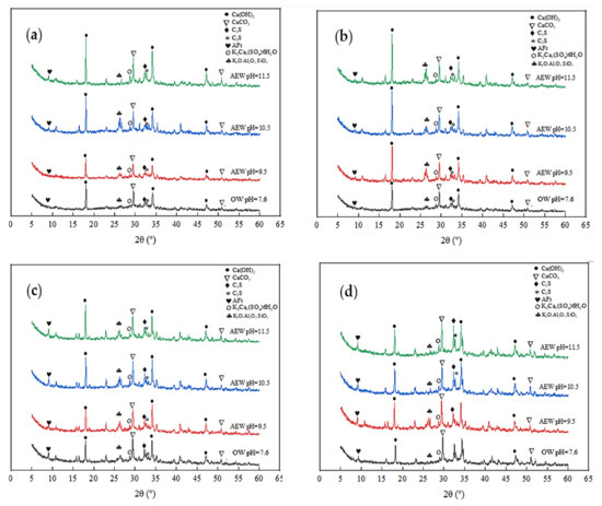 As shown in Figure 10, with increasing pH, the distribution of the hydration products in the cement paste changed from dispersion to gradual connection, and its structure gradually became denser. In Figure 10a, the Ca(OH)2 flake produced with the OW pure water sample at the age of 7 days was thin and irregular in shape, and had not yet gained a hexagonal plate shape. The needle-shaped ettringite produced was fine, and the inter-connection between the hydration products was poor. In Figure 10b, the ettringite in the hydration products of the AEW cement slurry sample with a pH of 9.5 overlapped each other to form a network structure. The Ca(OH)2 in the hydration product of the AEW sample with a pH of 10.5, as seen in Figure 10c, was lamellar, and closely connected with ettringite. As seen in Figure 10d, the hydration product at a pH of 11.5 was more compact, the macropores were reduced, and the overlapping of the lamellar Ca(OH)2 was closer.