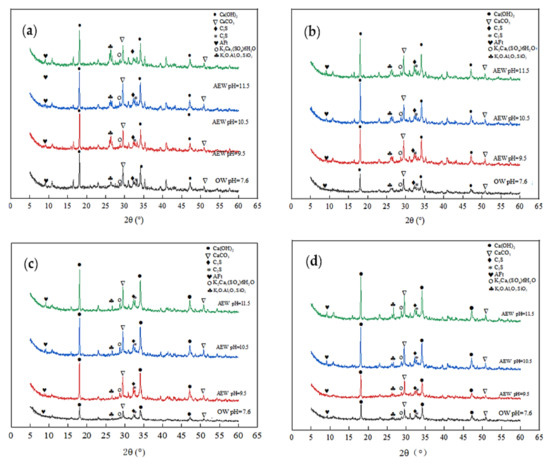 - AEW increased the formation of C-S-H gel, ettringite, and the Ca(OH)2 phase in cement hydration products. In addition, unlike OW, potassium hydroxide (KOH) in potassium-based AEW reacted with active minerals Al2O3 and SiO2 in cement and FA to form certain amounts of polycalcium potassium gypsum and potassium feldspar, which proved beneficial to the improvement of macroscopic strength.