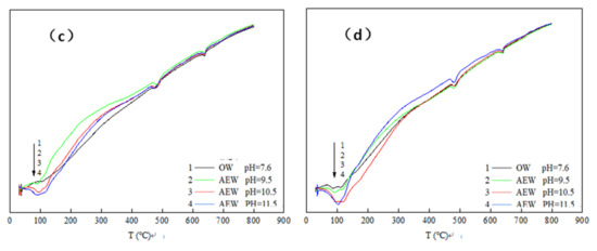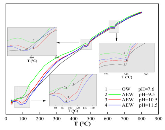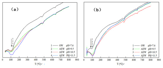 At the 100 °C temperature, the endothermic peak of OWP was not apparent; the peak depth of the experimental group with a pH of 9.5 increased prominently; the endothermic peak of the experimental group with a pH of 10.5 deepened further; the endothermic peak of the experimental group with a pH of 11.5 both widened and deepened, indicating that AEW promoted the formation of hydration products with an increased AEW pH value, and the appearance of C-S-H gel and AFt increased. When the temperature rose to 470~490 °C, the endothermic peak for the ordinary water test group was gentle: The endothermic peak with a pH of 9.5 was deepened and widened, and the endothermic peaks of the test groups with a pH of 10.5 and 11.5 were further broadened. Hence, we concluded that AEW promoted the formation of the hydration product Ca(OH)2 when heated to 645 °C. The order of areas for the respective CaCO3 endothermic peaks in each experimental group was pH = 9.5 AEW > pH = 11.5 AEW > pH = 7.6 AEW > pH = 10.5 AEW. The law of endothermic peaks differed for the first two peaks because AEW promoted the hydration process and inhibited simultaneous carbonization. The superposition of positive and negative reaction effects made the CaCO3 content in the experimental group different from the above two hydration products.