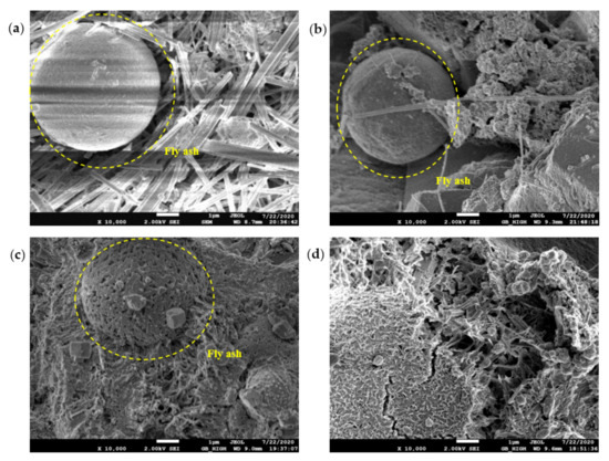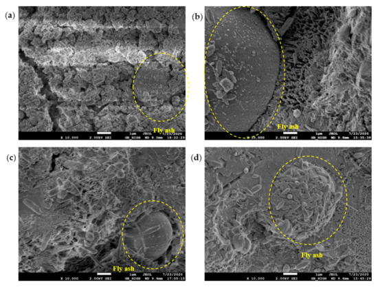 SEM diagram of pure cement paste (FA replacement ratio is 30%) at 28 days of age: (a) pH = 7.6 OW; (b) pH = 9.5 AEW; (c) pH = 10.5 AEW; (d) pH = 11.5 AEW.