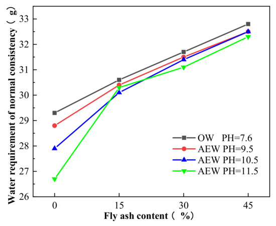 Figure 14 shows that with an increased FA substitution rate, the water requirement for a normal consistency of cement paste mixed with OW and AEW showed an upward trend. However, for a certain FA substitution ratio, the water requirement for a normal consistency of alkaline electrolyzed water paste (AEWP) with three different pH values was lower than that of OWP, and increased pH value in AEW the water requirement for normal consistency of AEW decreased. For example, when the pH of AEW was 11.5, the water requirement for the normal consistency of pure cement paste was at its lowest, 8.9% lower than that of OW pure cement paste. This result shows that AEW improved the fluidity of cement paste, and when the pH value was 11.5, the fluidity of the cement paste was at its best. This fact, too, was due to the small clustered structure of the water molecules in AEW, which made it easier for the water molecules to adhere to the surface of the cement particles uniformly. Simultaneously, the charged free radicals had the same charge dispersion effect on the agglomerated cement particles, which slowed down the flocculation phenomenon of the cement particles, increased the contact surface between the water molecules and cement FA particles, and made the water molecules play a better lubrication role, thus achieving the effect of the improved fluidity of the cement mixture [39].