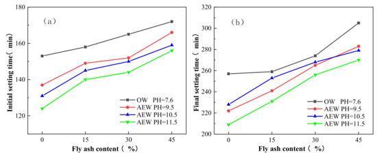 Initial and final setting times of OW and AEW with different pH for different FA replacements: (a) Initial setting time; (b) Final setting time.