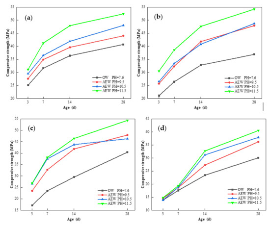 Effect of OW and AEW with different pH values on the compressive strength of FAM: (a) FA = 0; (b) FA = 15%; (c) FA = 30%; (d) FA = 45%.
