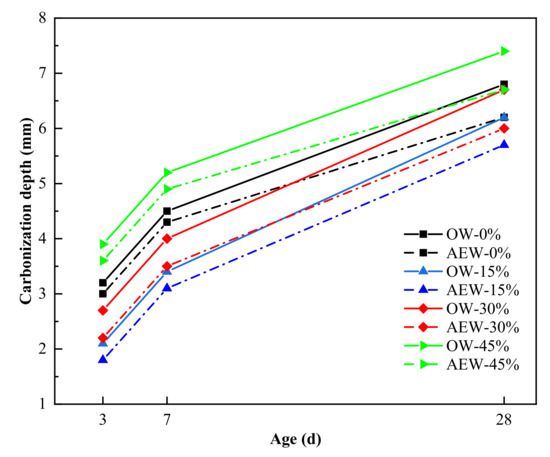 Figure 17 shows the carbonation resistance of concrete. In this figure, OW-0% refers to the concrete with 0% fly ash content prepared by ordinary water. AEW-0% refers to the concrete with 0% fly ash content prepared by alkaline electrolytic water. OW-45% refers to the concrete with 45% fly ash content prepared by ordinary water. AEW-45% refers to the concrete with 45% fly ash content prepared by alkaline electrolytic water.