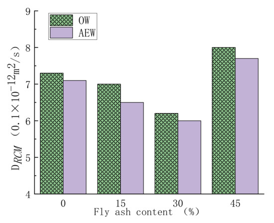 Chloride ion transport coefficient of concrete with OW and AEW with a pH value of 11.5 under different FA replacements.