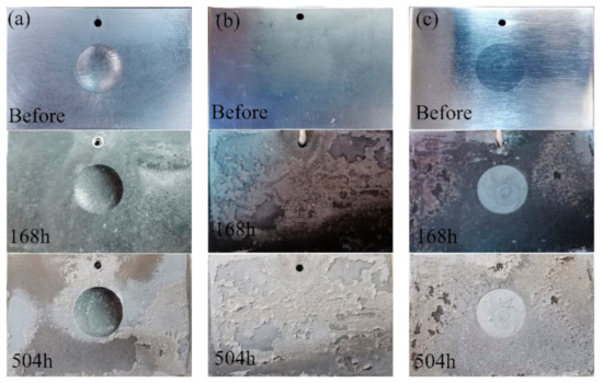 Figure 8 shows the surface appearances of the samples after the alternate immersion tests. Clearly, all of the samples lost their metallic luster and looked dark after the alternate immersion tests for 168 h. In addition, some white corrosion products were observed in the substrate. The repaired areas in the CS samples were much brighter and showed a better surface appearance compared with the nearby substrate. After alternate immersion tests for 504 h, the 7N01-T4 samples and the CS samples were mostly covered with white products. The repaired areas in the CS samples still had brighter surfaces. This suggests that the corrosion products on the 7N01-T4 samples and the CS samples had a protective effect. When observing the UR samples, there was only a small quantity of white products in the substrate, far from the pit. The pit was in as terrible of a condition as before. Hence, there were no dense or protective corrosion layers on the surfaces of the UR samples during the corrosion process.