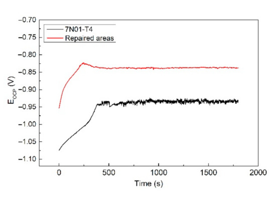 Electrochemical tests were conducted in order to study the corrosion behavior of the CS samples. The CS samples for the electrochemical tests were taken entirely from the repaired areas. Figure 10 shows the open circuit potential of the samples before the alternate immersion tests. It shows that the EOCP curves of both samples were similar. The EOCP had a repaid increase in the initial stage and tended to be subsequently stable. The rapid increase in the EOCP could be attributed to the passivation process on the fresh samples. Then, a passive film was formed, resulting in a stable EOCP. By comparison, the EOCP of the repaired areas was apparently higher than that of 7N01-T4. This indicates that the repaired areas had a lower corrosion tendency in comparison to 7N01-T4 [30]. In other words, there would be a potential difference between the repaired areas and the nearby substrate in the CS samples. Thus, there remained a galvanic corrosion between the repaired areas and the nearby substrate. The repaired areas were protected as a cathode, and the nearby substrate was corroded as an anode.