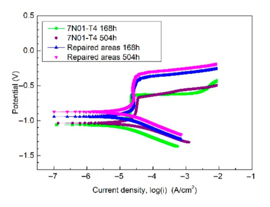 Figure 11 shows the potentiodynamic polarization curves of the samples after the alternate immersion tests. Table 4 gives the related electrochemical parameters. As depicted, the repaired areas in the CS samples showed better corrosion resistance compared with 7N01-T4 due to the result that the Ecorr was higher and the Icorr was lower after the corrosion tests not only for 168 h, but also for 504 h. In addition, there was a small increase in Ecorr and a small decrease in Icorr after the alternate immersion tests for 504 h. So, the corrosion products on the samples had a positive effect on preventing the inner substrate from being corroded by the corrosive medium.