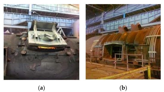Figure 1 presents the original layout of the furnace and the port that is integrated by six plates cooled by water. Figure 1a shows the furnace in service and the original port in the closed position, where improper sealing can be easily appreciated. This implies heat losses and the contamination of the working area with combustion gases. The lack of sealing is due to an accretion layer that adheres to the bottom plates of the furnace port. Figure 1b shows the furnace during a maintenance shutdown without the cover.