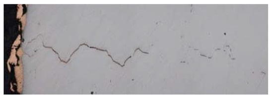 - The new design shall guarantee a metal skin temperature below 750 K, to prevent copper infiltration into the steel plates [11]. Infiltration damages the base metal and may cause a catastrophic failure [12]. Figure 2 shows a micrograph of a S345J steel plate where the infiltration of copper can be appreciated. Figure 2 shows an approximately 2 mm infiltration, derived from a speed of 3 µm/s [13]. Although it has nearly no effect on properties such as the density or the specific heat, the infiltration process also increases the local conductivity of the metal, boosting the heat transfer [14].