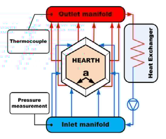 One of the most restrictive specifications of the furnace port was the necessity of preventing the formation of an accretion layer of slag over the surface of the bottom plates. For this reason, reducing the temperature of the port plate surface as much as possible was required. Figure 3 shows the scheme of the original port cooling system. The six plates that form the furnace port had internal orifices that allow cooling water circulation, evacuating the heat transferred by the slag during the pouring process. Plates referred to as “a” in Figure 3 are particularly relevant, since they are in close contact with 1400 K slag during this operation. After leaving the port plates, the water flow (0.7 kg/s) was cooled in a cooling tower, reaching an almost constant temperature of 300 K downstream of the cooling water pump. The original cooling system had a temperature gauge in the outlet header, where the flow coming from the six plates mixed. Since each plate received a different heat flow, the bottom plates being higher, the temperature of the outlet header did not allow the evaluation of the temperature increase in the cooling water corresponding to each plate. Therefore, this average temperature underestimated the temperature of the cooling water coming from the bottom plates.
