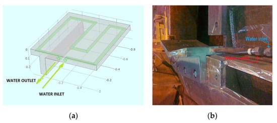 Figure 4a shows a modeled view of the original design of the bottom plate, including the internal canalization for the cooling water. Furthermore, Figure 4b presents the two bottom plates installed on the furnace, showing a detail of the cooling water connections.