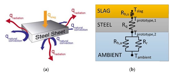 A transient finite element model was developed to evaluate the convective heat transfer coefficient between the slag and the port metal [16,17]. The overall heat transfer process is controlled by the heat transfer from the slag and the radiative heat loss to the surroundings, the convective heat transfer to the air being less relevant [18]. As stated in Figure 5b, the heat flux between the ambient and the prototype lower surface (, Equation (1)), combines convective (, Equation (2)) and radiative (, Equation (3)) transfer mechanisms.