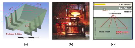 To characterize the actual temperature of the bottom plates of the port, a prototype based on a 15 mm thickness S275JR steel plate was built. The prototype main dimensions are characterized in Figure 6a. The slag at 1400 K was poured over the prototype from a 10 m3 crucible. During the experiment, the slag flowed and completely covered the bottom plate of the prototype, creating a layer equivalent to the actual layer created during furnace pouring (35–50 mm thick and 0.5–0.6 m/s). Figure 6b shows a picture of the prototype during the test, where the pouring of the slag from the crucible to the prototype can be observed. Finally, Figure 6c presents side and plant views of the prototype, including the location of the four evenly spaced thermocouples to measure the time-dependent temperature evolution on the back of the prototype. Type N thermocouples were used and the data logger acquired data at 1 kHz frequency.