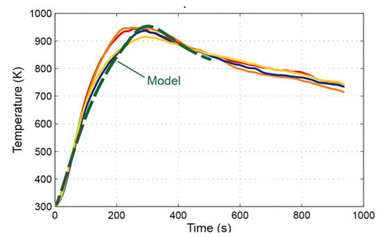 Equation (6) evaluates the deviation between the temperature of the lower surface provided by the model (calculated in an intermediate point among the four thermocouples) and the average temperature from the four thermocouples installed in the prototype. To conclude with the calculation of the convective coefficient, Figure 7 shows the temporal evolution of the temperatures measured in the four thermocouples installed in the prototype, including the model output for the optimal value of (). A sensitivity analysis was performed to analyze the dependence of the optimal within the typical range of [19], resulting in a negligible dispersion of the optimal . Finally, the slight mismatch observed in the temperature evolution between the experiment and the model results was irrelevant for the evaluation of alternative designs of the furnace port. Moreover, although no reference regarding the convective heat transfer coefficient between the copper slag and the furnace plates was found, values ranging from 120 to 450 W/m2K are estimated for molten steel [20,21].