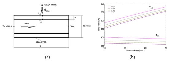 To establish a preliminary estimation of the influence of the mentioned design parameters over the upper surface temperature of the port plate, a simplified two-dimensional model was developed (Figure 9). This model was integrated by a semi-infinite plate of dimension S, with constant both plate thickness and channel area and variable water mass flow and internal sheet thickness (e). As in previous models, the heat was transferred from the slag at a constant temperature of 1400 K with . Regarding the convective heat transfer, the cooling water flow was considered fully developed in the turbulent regime [26]. In Figure 9b, where the cooling water inlet temperature is 300 K, parameters and are the average values of metal temperature in the upper and lower side of the plate, respectively. The transport properties of water were evaluated at the water average temperature (), being nearly constant over the analyzed range. Finally, the Reynolds number was far greater than 30,000 for the tested conditions. The preliminary conclusions derived from the results of the simplified two-dimensional analysis (Figure 9b) were the following: