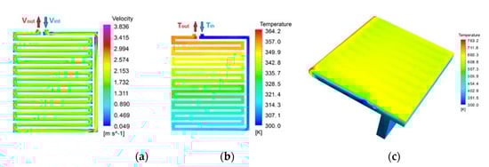 Figure 10 shows the outputs of the stationary 3D model for the proposed alternative design, based in 17 channels (N), sheet thickness of 20 mm (e) and cooling water mass flow of 0.7 kg/s (). As expected, the cooling water speed (Figure 10a) was almost constant except in the corners, where the deviations regarding the average speed were identified. The cooling water temperature (Figure 10b) increased in almost a linear trend from the inlet to the outlet. The external metal temperature (Figure 10c) was almost uniform (~630 K), although the effect of the channels can be appreciated due to a small thermal difference. As expected, the highest temperatures were located at the internal edges, where the surface-to-volume ratio was higher. For this reason, these areas were rounded, as shown in Figure 8a.