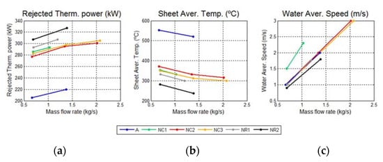 - Regardless of the cooling water mass flow, an increase in the sheet thickness implied an increase in and a reduction of , therefore diminishing the thermal energy extracted from the plate.