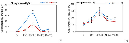 Concentration of phosphorus in soils and their blends treated with 2 wt.% poultry manure (PM) and biocidal agents B1—calcium peroxide, B2—sodium percarbonate, B3—calcium hydroxide, S—soils without treatment (S1 or S2); (a) extraction with water, (b) extraction with calcium lactate (Egner–Riehm method).