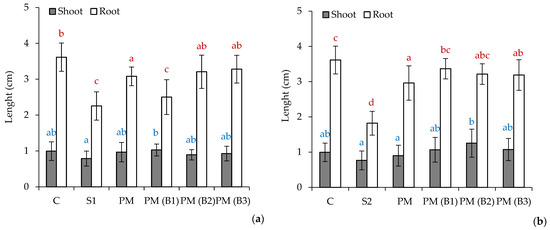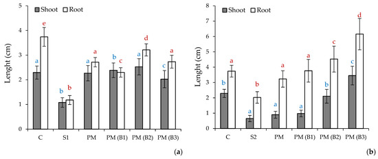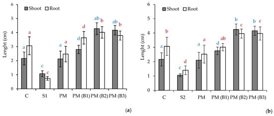 Data represent the average value ± the standard deviation (n = 15) of the length of roots and shoots of the Lepidium sativum L. seeds tested on soil S1 (a) and S2 (b). Different letters indicate no significant differences Tukey’s test HSD (p > 0.05); C—reference soil.