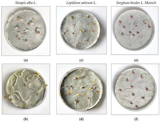 Exemplary photos of plants after germination test: (a) Sinapis alba L. on soil S2; (b) Sinapis alba L. on soil S2 treated with PM(B2) on soil S2; (c) Lepidium sativum L. on soil S1; (d) Lepidium sativum L. on soil S1 treated with PM(B2); (e) Sorghum bicolor on soil S2; (f) Sorghum bicolor on soil S2 treated with PM(B1).