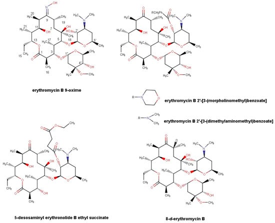 - Gasc, J.C.; D’Ambrieres, S.G.; Lutz, A.; Chantot, J.F. New ether oxime derivatives of erythromycin A: A structure activity relationship study. J. Antibiot. 1991, 44, 313–331. [Google Scholar] [CrossRef][Green Version]