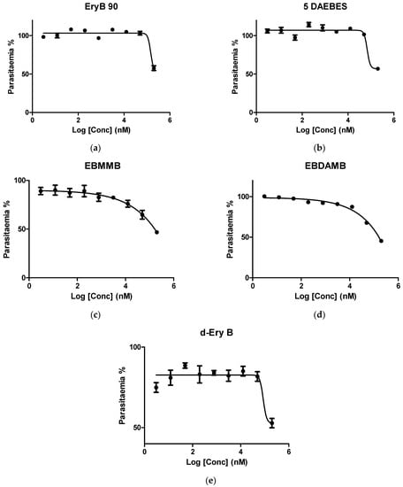 The investigated compounds exhibited anti-malarial activities with micromolar IC50 values against the multi-drug-resistant P. falciparum strain K1 (Figure 2). Erythromycin B 9-oxime gave an IC50 value of 146.0 μM; 5-desosaminyl erythronolide B ethyl succinate gave an IC50 value of 68.6 μM; and 8-d-erythromycin B gave an IC50 of 86.8 μM. Both erythromycin B 2′-[3-(morpholinomethyl)benzoate] and erythromycin B 2′-[3-(dimethylaminomethyl)benzoate] were less active, with IC50 values of more than 200 μM.