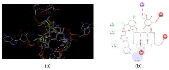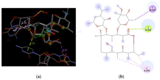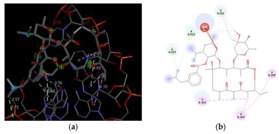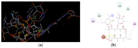 (a) Graphical representation of the obtained interactions between 5-desosaminyl erythronolide B ethyl succinate and the segment of the exit tunnel from apicoplast ribosome of P. falciparum with distances in Å; (b) 2D diagram of receptor–ligand interactions.