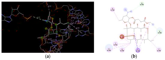 (a) Graphical representation of the obtained interactions between erythromycin B 2′-[3-(dimethylaminomethyl)benzoate] and the segment of the exit tunnel from apicoplast ribosome of P. falciparum with distances in Å; (b) 2D diagram of receptor–ligand interactions.