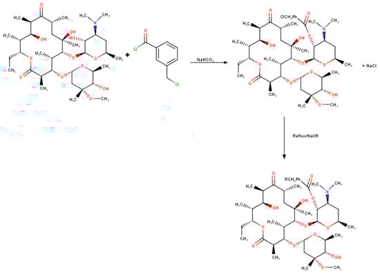 N-substituted 2′-(3-aminomethylbenzoate) esters of erythromycin B were synthesised in two steps. In the first step, erythromycin B was esterified at C-2′ with 3-chloromethylbenzoyl chloride. In the second step, the product erythromycin B 2′-[3-chloromethylbenzoate] was heated at reflux with the appropriate amine (R) in the presence of sodium iodide as a catalyst (Scheme 1) [].