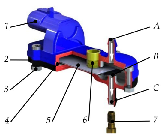 The low-pressure gas-phase injector analyzed: 1—upper casing with electrical connection; 2—bottom housing; 3—screw connector; 4—gasket; 5—piezoelectric converter; 6—limiter with gasket; 7—outlet nozzle; A—inlet; B—valve; C—outlet.