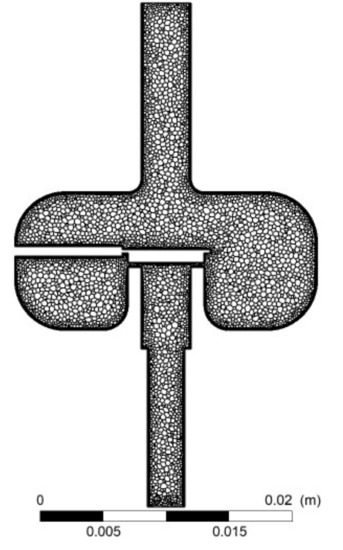 Example of polyhedral mesh in the longitudinal plane of the injector at the opening h = 0.4 mm and the outlet nozzle diameter d = 3 mm.