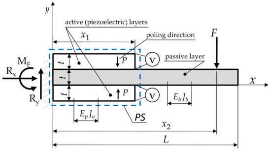 It allows the transducer to be treated as a homogeneous single-layer beam with a locally located three-layer PS that contains two components: piezoelectric (active) and nonpiezoelectric (passive). In the transducer (Figure 4), the left side is fixed, while the right side can move freely. The operating load comes from an external force F (generated by the gas-intake manifold pressure difference, occurring only in the closed state) and an electric moment Me caused by an applied voltage V. Based on the equilibrium conditions of forces and moments, the values of the reactions in the fixed support were determined; they are .