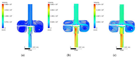 The streamlines shown in Figure 6 correlate with the pressure field descriptions. In the variant h = 0.1 mm, the highest flow velocities are located under the control plate seal, near the injector seat. For the opening h = 0.5 mm, the maximum flow velocities are reached in the part behind the valve and at the beginning of the outlet nozzle. Opening h = 1 mm causes maximum velocities to appear behind the front of the inlet nozzle.