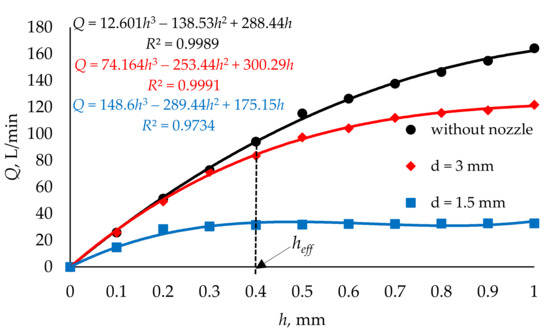 Based on the volumetric flow rate read from the injector’s outlet surface, its flow characteristics were determined for different variants of the outlet port. These were variants without and with d = 1.5 and 3 mm nozzles. It can be seen (Figure 7) that there is a significant effect on the volumetric flow rate value caused by the nozzle diameter, which restricts the flow. For the nozzle diameter d = 1.5 mm, the volumetric flow rate stabilizes above the opening degree (valve lift) of the injector of h = 0.2 mm. In the case of nozzle diameter d = 3 mm, the flow rate changes only slightly above h = 0.6 mm of valve lift, while in the case of the variant without nozzle, the flow rate increases over the entire range tested. The maximum values of volumetric flow rate in the tested range (0–1 mm) were as follows: d = 1.5 mm—Q = 32.82 L/min; d = 3 mm—Q = 121.93 L/min; without nozzle (d = 4 mm)—Q = 164.31 L/min. The variant without nozzle is only a comparative one, as the low-pressure gas-phase injectors are assembled with nozzles, where the opening with diameter d = 3 mm is the maximum used in such systems, and the volumetric flow rate at the level of 80–100 L/min is the one required to supply the engine with gas [40,53]. The analysis of the characteristics presented in Figure 7 allowed the effective range of the injector opening to be defined as heff = 0.4 mm, which is similar to the piston injectors available on the market [54].