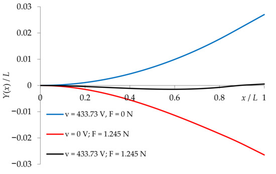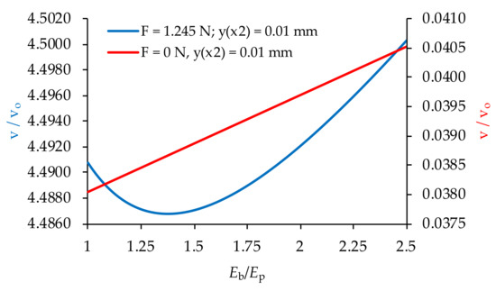 When analyzing the influence of Young’s moduli on the tested transducer performance, one should also consider the transducer relative stiffness—Eb/Ep. In the case of zero mechanical load (F = 0), achieving the desired deflection y(x2) requires the use of higher values of current voltage (Figure 8). The required voltage v increases proportionally to Eb/Ep. In the opposite case (F ≠ 0), an increase in the relative stiffness may result in an increase or decrease in the operating voltage v (Figure 8).